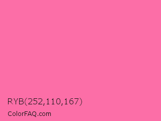 RYB 252,110,167 Color is a light rose color and the nearest color is French Pink #fd6c9e. Hex code #fc6ea7 and RGB value is rgb(252,110,167). In RGB color space, this color is composed of 99% red, 43% green, 65% blue, In CMYK color space, this color is composed of 0% cyan, 56% magenta, 34% yellow , 1% black , In HSL color space, this color has a hue angle of 336° , 96% saturation and 71% lightness.