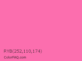RYB 252,110,174 Color is a light rose color and the nearest color is Hot Pink #ff69b4. Hex code #fc6eae and RGB value is rgb(252,110,174). In RGB color space, this color is composed of 99% red, 43% green, 68% blue, In CMYK color space, this color is composed of 0% cyan, 56% magenta, 31% yellow , 1% black , In HSL color space, this color has a hue angle of 333° , 96% saturation and 71% lightness.