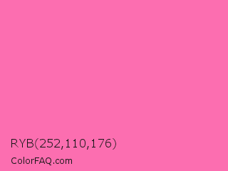 RYB 252,110,176 Color is a light rose color and the nearest color is Hot Pink #ff69b4. Hex code #fc6eb0 and RGB value is rgb(252,110,176). In RGB color space, this color is composed of 99% red, 43% green, 69% blue, In CMYK color space, this color is composed of 0% cyan, 56% magenta, 30% yellow , 1% black , In HSL color space, this color has a hue angle of 332° , 96% saturation and 71% lightness.