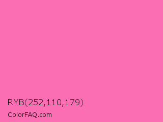 RYB 252,110,179 Color is a light rose color and the nearest color is Hot Pink #ff69b4. Hex code #fc6eb3 and RGB value is rgb(252,110,179). In RGB color space, this color is composed of 99% red, 43% green, 70% blue, In CMYK color space, this color is composed of 0% cyan, 56% magenta, 29% yellow , 1% black , In HSL color space, this color has a hue angle of 331° , 96% saturation and 71% lightness.