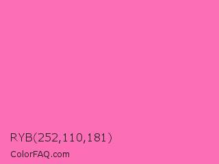RYB 252,110,181 Color is a light rose color and the nearest color is Hot Pink #ff69b4. Hex code #fc6eb5 and RGB value is rgb(252,110,181). In RGB color space, this color is composed of 99% red, 43% green, 71% blue, In CMYK color space, this color is composed of 0% cyan, 56% magenta, 28% yellow , 1% black , In HSL color space, this color has a hue angle of 330° , 96% saturation and 71% lightness.