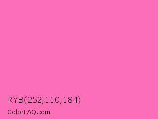 RYB 252,110,184 Color is a light rose color and the nearest color is Hot Pink #ff69b4. Hex code #fc6eb8 and RGB value is rgb(252,110,184). In RGB color space, this color is composed of 99% red, 43% green, 72% blue, In CMYK color space, this color is composed of 0% cyan, 56% magenta, 27% yellow , 1% black , In HSL color space, this color has a hue angle of 329° , 96% saturation and 71% lightness.