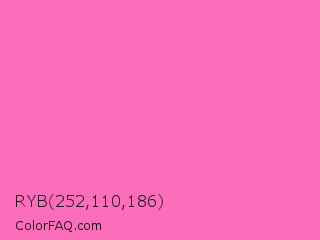 RYB 252,110,186 Color is a light rose color and the nearest color is Hot Pink #ff69b4. Hex code #fc6eba and RGB value is rgb(252,110,186). In RGB color space, this color is composed of 99% red, 43% green, 73% blue, In CMYK color space, this color is composed of 0% cyan, 56% magenta, 26% yellow , 1% black , In HSL color space, this color has a hue angle of 328° , 96% saturation and 71% lightness.