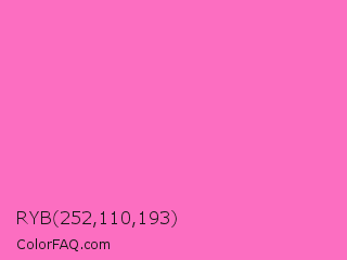 RYB 252,110,193 Color is a light magenta color and the nearest color is Rose Pink #ff66cc. Hex code #fc6ec1 and RGB value is rgb(252,110,193). In RGB color space, this color is composed of 99% red, 43% green, 76% blue, In CMYK color space, this color is composed of 0% cyan, 56% magenta, 23% yellow , 1% black , In HSL color space, this color has a hue angle of 325° , 96% saturation and 71% lightness.