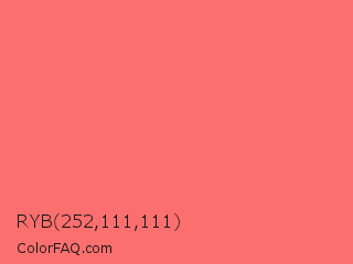RYB 252,111,111 Color is a light red color and the nearest color is Begonia #fa6e79. Hex code #fc6f6f and RGB value is rgb(252,111,111). In RGB color space, this color is composed of 99% red, 44% green, 44% blue, In CMYK color space, this color is composed of 0% cyan, 56% magenta, 56% yellow , 1% black , In HSL color space, this color has a hue angle of 0° , 96% saturation and 71% lightness.