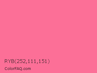 RYB 252,111,151 Color is a light rose color and the nearest color is French Pink #fd6c9e. Hex code #fc6f97 and RGB value is rgb(252,111,151). In RGB color space, this color is composed of 99% red, 44% green, 59% blue, In CMYK color space, this color is composed of 0% cyan, 56% magenta, 40% yellow , 1% black , In HSL color space, this color has a hue angle of 343° , 96% saturation and 71% lightness.