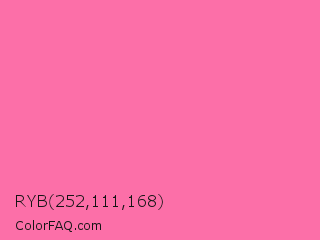 RYB 252,111,168 Color is a light rose color and the nearest color is Cyclamen #f56fa1. Hex code #fc6fa8 and RGB value is rgb(252,111,168). In RGB color space, this color is composed of 99% red, 44% green, 66% blue, In CMYK color space, this color is composed of 0% cyan, 56% magenta, 33% yellow , 1% black , In HSL color space, this color has a hue angle of 336° , 96% saturation and 71% lightness.