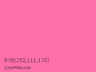 RYB 252,111,170 Color is a light rose color and the nearest color is Cyclamen #f56fa1. Hex code #fc6faa and RGB value is rgb(252,111,170). In RGB color space, this color is composed of 99% red, 44% green, 67% blue, In CMYK color space, this color is composed of 0% cyan, 56% magenta, 33% yellow , 1% black , In HSL color space, this color has a hue angle of 335° , 96% saturation and 71% lightness.