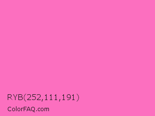 RYB 252,111,191 Color is a light magenta color and the nearest color is Hot Pink #ff69b4. Hex code #fc6fbf and RGB value is rgb(252,111,191). In RGB color space, this color is composed of 99% red, 44% green, 75% blue, In CMYK color space, this color is composed of 0% cyan, 56% magenta, 24% yellow , 1% black , In HSL color space, this color has a hue angle of 326° , 96% saturation and 71% lightness.