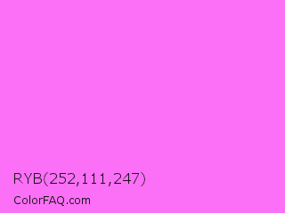 RYB 252,111,247 Color is a light magenta color and the nearest color is Pink Flamingo #fc74fd. Hex code #fc6ff7 and RGB value is rgb(252,111,247). In RGB color space, this color is composed of 99% red, 44% green, 97% blue, In CMYK color space, this color is composed of 0% cyan, 56% magenta, 2% yellow , 1% black , In HSL color space, this color has a hue angle of 302° , 96% saturation and 71% lightness.