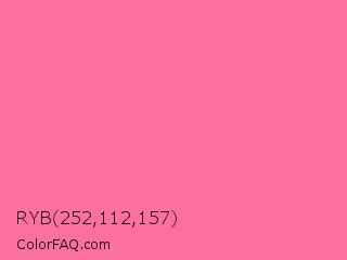 RYB 252,112,157 Color is a light rose color and the nearest color is French Pink #fd6c9e. Hex code #fc709d and RGB value is rgb(252,112,157). In RGB color space, this color is composed of 99% red, 44% green, 62% blue, In CMYK color space, this color is composed of 0% cyan, 56% magenta, 38% yellow , 1% black , In HSL color space, this color has a hue angle of 341° , 96% saturation and 71% lightness.