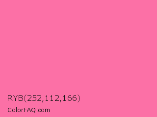 RYB 252,112,166 Color is a light rose color and the nearest color is Cyclamen #f56fa1. Hex code #fc70a6 and RGB value is rgb(252,112,166). In RGB color space, this color is composed of 99% red, 44% green, 65% blue, In CMYK color space, this color is composed of 0% cyan, 56% magenta, 34% yellow , 1% black , In HSL color space, this color has a hue angle of 337° , 96% saturation and 71% lightness.