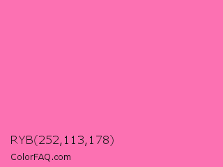 RYB 252,113,178 Color is a light rose color and the nearest color is Hot Pink #ff69b4. Hex code #fc71b2 and RGB value is rgb(252,113,178). In RGB color space, this color is composed of 99% red, 44% green, 70% blue, In CMYK color space, this color is composed of 0% cyan, 55% magenta, 29% yellow , 1% black , In HSL color space, this color has a hue angle of 332° , 96% saturation and 72% lightness.