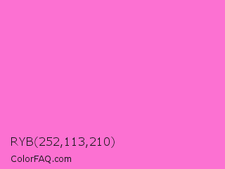 RYB 252,113,210 Color is a light magenta color and the nearest color is Rose Pink #ff66cc. Hex code #fc71d2 and RGB value is rgb(252,113,210). In RGB color space, this color is composed of 99% red, 44% green, 82% blue, In CMYK color space, this color is composed of 0% cyan, 55% magenta, 17% yellow , 1% black , In HSL color space, this color has a hue angle of 318° , 96% saturation and 72% lightness.
