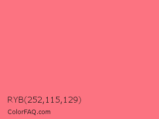 RYB 252,115,129 Color is a light red color and the nearest color is Froly #f57584. Hex code #fc7381 and RGB value is rgb(252,115,129). In RGB color space, this color is composed of 99% red, 45% green, 51% blue, In CMYK color space, this color is composed of 0% cyan, 54% magenta, 49% yellow , 1% black , In HSL color space, this color has a hue angle of 354° , 96% saturation and 72% lightness.