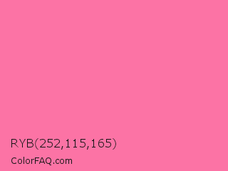 RYB 252,115,165 Color is a light rose color and the nearest color is Cyclamen #f56fa1. Hex code #fc73a5 and RGB value is rgb(252,115,165). In RGB color space, this color is composed of 99% red, 45% green, 65% blue, In CMYK color space, this color is composed of 0% cyan, 54% magenta, 35% yellow , 1% black , In HSL color space, this color has a hue angle of 338° , 96% saturation and 72% lightness.