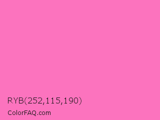 RYB 252,115,190 Color is a light magenta color and the nearest color is Persian Pink #f77fbe. Hex code #fc73be and RGB value is rgb(252,115,190). In RGB color space, this color is composed of 99% red, 45% green, 75% blue, In CMYK color space, this color is composed of 0% cyan, 54% magenta, 25% yellow , 1% black , In HSL color space, this color has a hue angle of 327° , 96% saturation and 72% lightness.