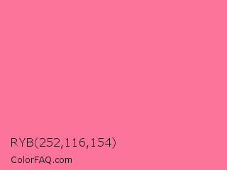 RYB 252,116,154 Color is a light rose color and the nearest color is French Pink #fd6c9e. Hex code #fc749a and RGB value is rgb(252,116,154). In RGB color space, this color is composed of 99% red, 45% green, 60% blue, In CMYK color space, this color is composed of 0% cyan, 54% magenta, 39% yellow , 1% black , In HSL color space, this color has a hue angle of 343° , 96% saturation and 72% lightness.
