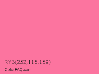 RYB 252,116,159 Color is a light rose color and the nearest color is French Pink #fd6c9e. Hex code #fc749f and RGB value is rgb(252,116,159). In RGB color space, this color is composed of 99% red, 45% green, 62% blue, In CMYK color space, this color is composed of 0% cyan, 54% magenta, 37% yellow , 1% black , In HSL color space, this color has a hue angle of 341° , 96% saturation and 72% lightness.