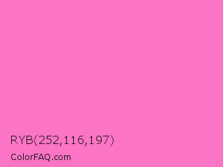 RYB 252,116,197 Color is a light magenta color and the nearest color is Persian Pink #f77fbe. Hex code #fc74c5 and RGB value is rgb(252,116,197). In RGB color space, this color is composed of 99% red, 45% green, 77% blue, In CMYK color space, this color is composed of 0% cyan, 54% magenta, 22% yellow , 1% black , In HSL color space, this color has a hue angle of 324° , 96% saturation and 72% lightness.