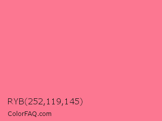 RYB 252,119,145 Color is a light red color and the nearest color is Froly #f57584. Hex code #fc7791 and RGB value is rgb(252,119,145). In RGB color space, this color is composed of 99% red, 47% green, 57% blue, In CMYK color space, this color is composed of 0% cyan, 53% magenta, 42% yellow , 1% black , In HSL color space, this color has a hue angle of 348° , 96% saturation and 73% lightness.