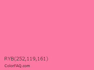RYB 252,119,161 Color is a light rose color and the nearest color is Tickle Me Pink Crayola #fc80a5. Hex code #fc77a1 and RGB value is rgb(252,119,161). In RGB color space, this color is composed of 99% red, 47% green, 63% blue, In CMYK color space, this color is composed of 0% cyan, 53% magenta, 36% yellow , 1% black , In HSL color space, this color has a hue angle of 341° , 96% saturation and 73% lightness.