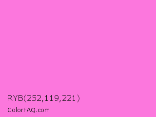 RYB 252,119,221 Color is a light magenta color and the nearest color is Pale Magenta #f984e5. Hex code #fc77dd and RGB value is rgb(252,119,221). In RGB color space, this color is composed of 99% red, 47% green, 87% blue, In CMYK color space, this color is composed of 0% cyan, 53% magenta, 12% yellow , 1% black , In HSL color space, this color has a hue angle of 314° , 96% saturation and 73% lightness.