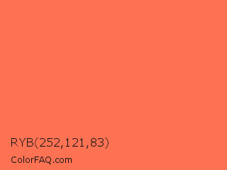 RYB 252,121,83 Color is a light red color and the nearest color is Persimmon #ff6b53. Hex code #fc7253 and RGB value is rgb(252,114,83). In RGB color space, this color is composed of 99% red, 45% green, 33% blue, In CMYK color space, this color is composed of 0% cyan, 55% magenta, 67% yellow , 1% black , In HSL color space, this color has a hue angle of 11° , 97% saturation and 66% lightness.
