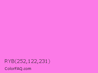 RYB 252,122,231 Color is a light magenta color and the nearest color is Pale Magenta #f984e5. Hex code #fc7ae7 and RGB value is rgb(252,122,231). In RGB color space, this color is composed of 99% red, 48% green, 91% blue, In CMYK color space, this color is composed of 0% cyan, 52% magenta, 8% yellow , 1% black , In HSL color space, this color has a hue angle of 310° , 96% saturation and 73% lightness.