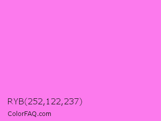 RYB 252,122,237 Color is a light magenta color and the nearest color is Light Fuchsia Pink #f984ef. Hex code #fc7aed and RGB value is rgb(252,122,237). In RGB color space, this color is composed of 99% red, 48% green, 93% blue, In CMYK color space, this color is composed of 0% cyan, 52% magenta, 6% yellow , 1% black , In HSL color space, this color has a hue angle of 307° , 96% saturation and 73% lightness.