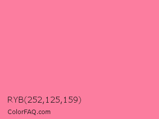 RYB 252,125,159 Color is a light rose color and the nearest color is Tickle Me Pink Crayola #fc80a5. Hex code #fc7d9f and RGB value is rgb(252,125,159). In RGB color space, this color is composed of 99% red, 49% green, 62% blue, In CMYK color space, this color is composed of 0% cyan, 50% magenta, 37% yellow , 1% black , In HSL color space, this color has a hue angle of 344° , 95% saturation and 74% lightness.