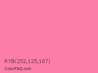 RYB 252,125,167 Color is a light rose color and the nearest color is Tickle Me Pink Crayola #fc80a5. Hex code #fc7da7 and RGB value is rgb(252,125,167). In RGB color space, this color is composed of 99% red, 49% green, 65% blue, In CMYK color space, this color is composed of 0% cyan, 50% magenta, 34% yellow , 1% black , In HSL color space, this color has a hue angle of 340° , 95% saturation and 74% lightness.