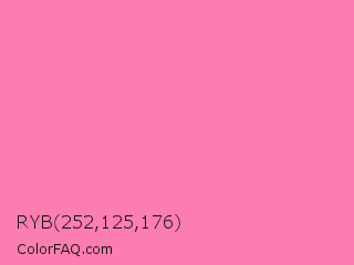 RYB 252,125,176 Color is a light rose color and the nearest color is Tickle Me Pink Crayola #fc80a5. Hex code #fc7db0 and RGB value is rgb(252,125,176). In RGB color space, this color is composed of 99% red, 49% green, 69% blue, In CMYK color space, this color is composed of 0% cyan, 50% magenta, 30% yellow , 1% black , In HSL color space, this color has a hue angle of 336° , 95% saturation and 74% lightness.