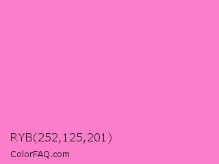 RYB 252,125,201 Color is a light magenta color and the nearest color is Princess Perfume #ff85cf. Hex code #fc7dc9 and RGB value is rgb(252,125,201). In RGB color space, this color is composed of 99% red, 49% green, 79% blue, In CMYK color space, this color is composed of 0% cyan, 50% magenta, 20% yellow , 1% black , In HSL color space, this color has a hue angle of 324° , 95% saturation and 74% lightness.