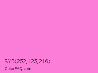 RYB 252,125,216 Color is a light magenta color and the nearest color is Princess Perfume #ff85cf. Hex code #fc7dd8 and RGB value is rgb(252,125,216). In RGB color space, this color is composed of 99% red, 49% green, 85% blue, In CMYK color space, this color is composed of 0% cyan, 50% magenta, 14% yellow , 1% black , In HSL color space, this color has a hue angle of 317° , 95% saturation and 74% lightness.