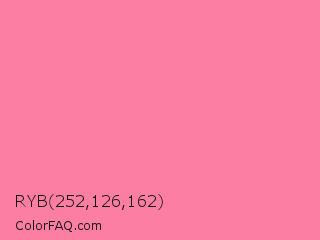 RYB 252,126,162 Color is a light rose color and the nearest color is Tickle Me Pink Crayola #fc80a5. Hex code #fc7ea2 and RGB value is rgb(252,126,162). In RGB color space, this color is composed of 99% red, 49% green, 64% blue, In CMYK color space, this color is composed of 0% cyan, 50% magenta, 36% yellow , 1% black , In HSL color space, this color has a hue angle of 343° , 95% saturation and 74% lightness.