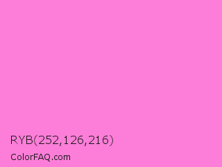 RYB 252,126,216 Color is a light magenta color and the nearest color is Princess Perfume #ff85cf. Hex code #fc7ed8 and RGB value is rgb(252,126,216). In RGB color space, this color is composed of 99% red, 49% green, 85% blue, In CMYK color space, this color is composed of 0% cyan, 50% magenta, 14% yellow , 1% black , In HSL color space, this color has a hue angle of 317° , 95% saturation and 74% lightness.