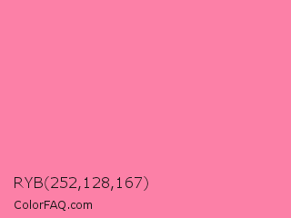 RYB 252,128,167 Color is a light rose color and the nearest color is Tickle Me Pink Crayola #fc80a5. Hex code #fc80a7 and RGB value is rgb(252,128,167). In RGB color space, this color is composed of 99% red, 50% green, 65% blue, In CMYK color space, this color is composed of 0% cyan, 49% magenta, 34% yellow , 1% black , In HSL color space, this color has a hue angle of 341° , 95% saturation and 75% lightness.