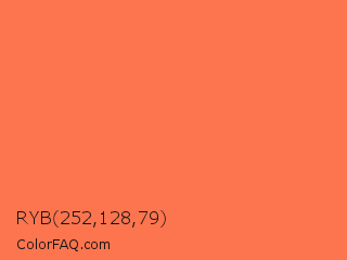 RYB 252,128,79 Color is a light red color and the nearest color is Outrageous Orange #ff6e4a. Hex code #fc754f and RGB value is rgb(252,117,79). In RGB color space, this color is composed of 99% red, 46% green, 31% blue, In CMYK color space, this color is composed of 0% cyan, 54% magenta, 69% yellow , 1% black , In HSL color space, this color has a hue angle of 13° , 97% saturation and 65% lightness.