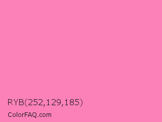 RYB 252,129,185 Color is a light rose color and the nearest color is Persian Pink #f77fbe. Hex code #fc81b9 and RGB value is rgb(252,129,185). In RGB color space, this color is composed of 99% red, 51% green, 73% blue, In CMYK color space, this color is composed of 0% cyan, 49% magenta, 27% yellow , 1% black , In HSL color space, this color has a hue angle of 333° , 95% saturation and 75% lightness.