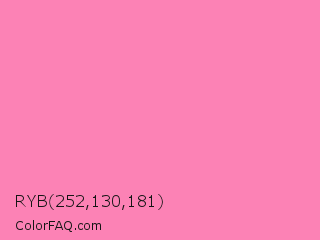 RYB 252,130,181 Color is a light rose color and the nearest color is Persian Pink #f77fbe. Hex code #fc82b5 and RGB value is rgb(252,130,181). In RGB color space, this color is composed of 99% red, 51% green, 71% blue, In CMYK color space, this color is composed of 0% cyan, 48% magenta, 28% yellow , 1% black , In HSL color space, this color has a hue angle of 335° , 95% saturation and 75% lightness.