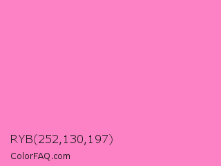 RYB 252,130,197 Color is a light magenta color and the nearest color is Persian Pink #f77fbe. Hex code #fc82c5 and RGB value is rgb(252,130,197). In RGB color space, this color is composed of 99% red, 51% green, 77% blue, In CMYK color space, this color is composed of 0% cyan, 48% magenta, 22% yellow , 1% black , In HSL color space, this color has a hue angle of 327° , 95% saturation and 75% lightness.