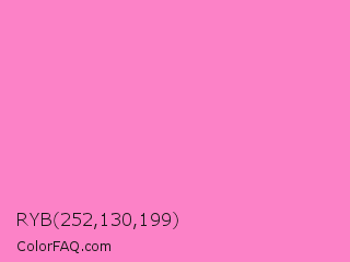 RYB 252,130,199 Color is a light magenta color and the nearest color is Princess Perfume #ff85cf. Hex code #fc82c7 and RGB value is rgb(252,130,199). In RGB color space, this color is composed of 99% red, 51% green, 78% blue, In CMYK color space, this color is composed of 0% cyan, 48% magenta, 21% yellow , 1% black , In HSL color space, this color has a hue angle of 326° , 95% saturation and 75% lightness.