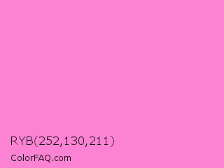 RYB 252,130,211 Color is a light magenta color and the nearest color is Princess Perfume #ff85cf. Hex code #fc82d3 and RGB value is rgb(252,130,211). In RGB color space, this color is composed of 99% red, 51% green, 83% blue, In CMYK color space, this color is composed of 0% cyan, 48% magenta, 16% yellow , 1% black , In HSL color space, this color has a hue angle of 320° , 95% saturation and 75% lightness.
