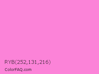 RYB 252,131,216 Color is a light magenta color and the nearest color is Princess Perfume #ff85cf. Hex code #fc83d8 and RGB value is rgb(252,131,216). In RGB color space, this color is composed of 99% red, 51% green, 85% blue, In CMYK color space, this color is composed of 0% cyan, 48% magenta, 14% yellow , 1% black , In HSL color space, this color has a hue angle of 318° , 95% saturation and 75% lightness.