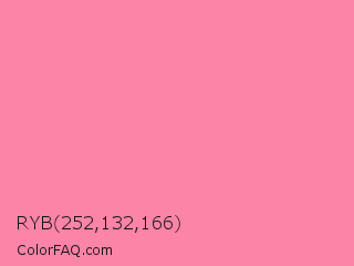 RYB 252,132,166 Color is a light rose color and the nearest color is Tickle Me Pink Crayola #fc80a5. Hex code #fc84a6 and RGB value is rgb(252,132,166). In RGB color space, this color is composed of 99% red, 52% green, 65% blue, In CMYK color space, this color is composed of 0% cyan, 48% magenta, 34% yellow , 1% black , In HSL color space, this color has a hue angle of 343° , 95% saturation and 75% lightness.