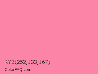 RYB 252,133,167 Color is a light rose color and the nearest color is Tickle Me Pink Crayola #fc80a5. Hex code #fc85a7 and RGB value is rgb(252,133,167). In RGB color space, this color is composed of 99% red, 52% green, 65% blue, In CMYK color space, this color is composed of 0% cyan, 47% magenta, 34% yellow , 1% black , In HSL color space, this color has a hue angle of 343° , 95% saturation and 75% lightness.