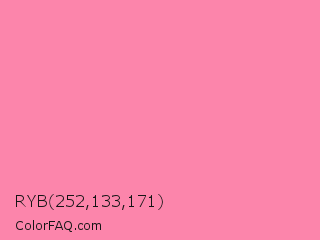 RYB 252,133,171 Color is a light rose color and the nearest color is Tickle Me Pink #fc89ac. Hex code #fc85ab and RGB value is rgb(252,133,171). In RGB color space, this color is composed of 99% red, 52% green, 67% blue, In CMYK color space, this color is composed of 0% cyan, 47% magenta, 32% yellow , 1% black , In HSL color space, this color has a hue angle of 341° , 95% saturation and 75% lightness.
