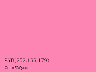 RYB 252,133,179 Color is a light rose color and the nearest color is Tickle Me Pink #fc89ac. Hex code #fc85b3 and RGB value is rgb(252,133,179). In RGB color space, this color is composed of 99% red, 52% green, 70% blue, In CMYK color space, this color is composed of 0% cyan, 47% magenta, 29% yellow , 1% black , In HSL color space, this color has a hue angle of 337° , 95% saturation and 75% lightness.