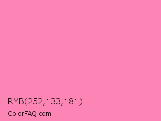 RYB 252,133,181 Color is a light rose color and the nearest color is Tickle Me Pink #fc89ac. Hex code #fc85b5 and RGB value is rgb(252,133,181). In RGB color space, this color is composed of 99% red, 52% green, 71% blue, In CMYK color space, this color is composed of 0% cyan, 47% magenta, 28% yellow , 1% black , In HSL color space, this color has a hue angle of 336° , 95% saturation and 75% lightness.